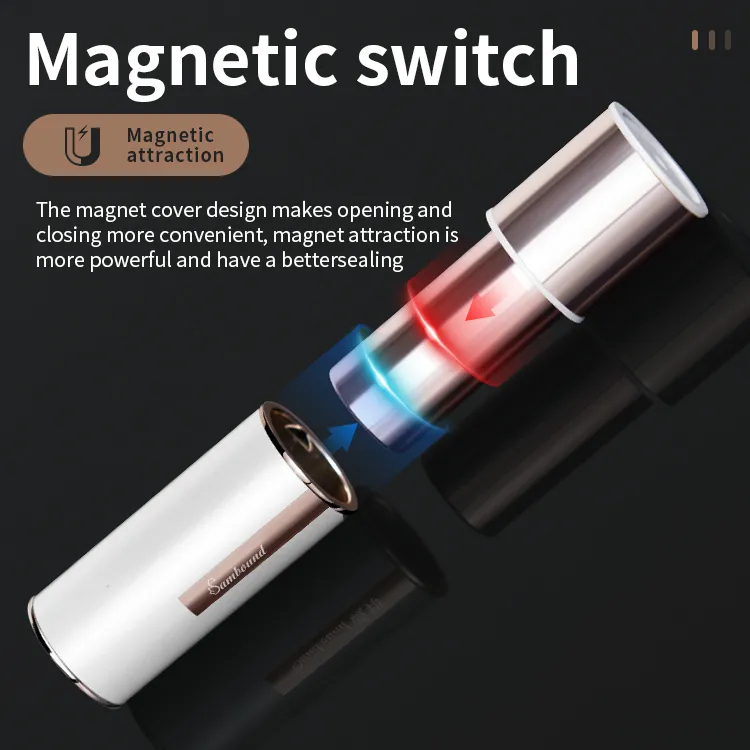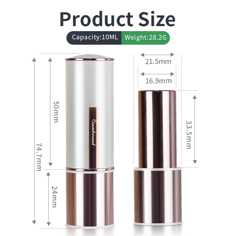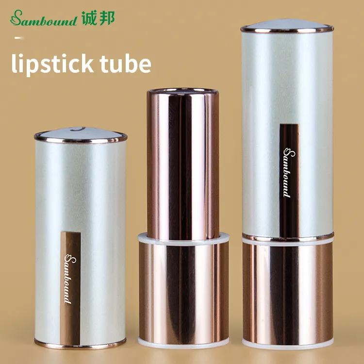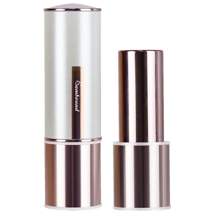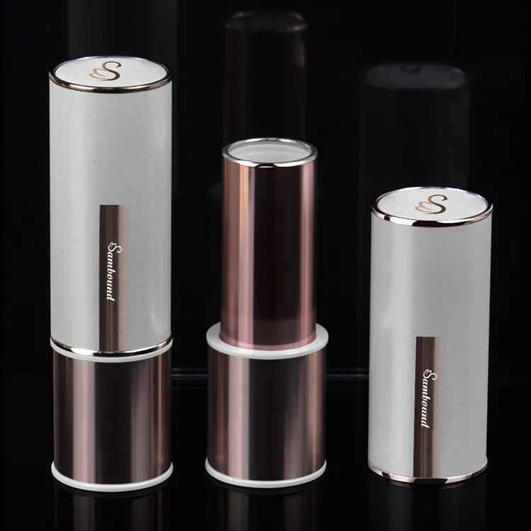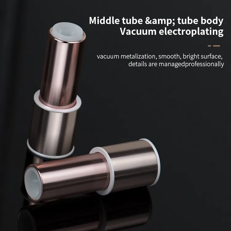 Elegant rose gold round magnetic lipstick tube with customizable finishes and branding. Designed for premium cosmetic packaging solutions.